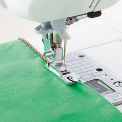 Denne trykfod bruges til at sy i kanten af stoffet med zigzag sting, mens foden sørger for at folde stoffet dobbelt, for en smal bredde. Spiralhjælperen på denne trykfod ruller kanten af stoffet mens den smalt rullede fold er syet med zigzag sting. Denne trykfod kan sy tynde og solide kantafslutning.