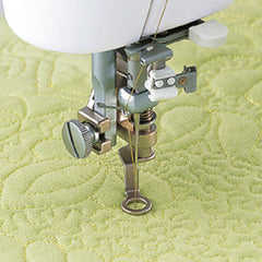 Denne trykfod anvendes til frihåndsquiltning, hvor den øvre transportør sænkes for at give dig fri bevægelighed til at manipulere stoffet og skabe mønstre med dine sting. Afstanden fra nålens nedslagspunkt til den ydre kant af trykfoden er 5 mm, hvilket giver dig en god kontrol og præcision under syningen. Da trykfoden bevæger sig op og ned synkront med nålen, kan selv tykke sømme let krydses, hvilket gør den ideel til mange forskellige quiltprojekter.