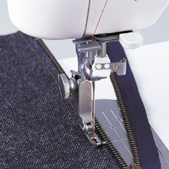 Denne smalle hængslede trykfod er ideel til applikationer såsom at sy lynlåse og smalle stykker stof. Den 3 mm smalle afstand fra nålen til kanten af trykfoden gør den perfekt til præcis sømning på smalle stykker. Ved at placere trykfodens kant parallelt med lynlåsens tænder kan du sy med en præcis sømbredde på kun 3 mm.