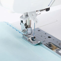Denne trykfod er ideel til at sy blinde foldesøm, som anvendes langs folden på eksempelvis bukser og nederdele, hvilket resulterer i usynlige sting på forsiden af stoffet. Ved at føre stoffets fold lineært langs trykfodens hjælpeanordning fanges kun få tråde fra stoffet i stingene, og dette sker ensartet. Du kan tilpasse nålens indgangspunkt eller hjælpeanordningens position, så det passer til stoffet, før du starter syningen. Denne trykfod kan også bruges som en hjælp, når du justerer nålepositionen for en lige linje med foldesøm.
