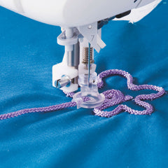 Denne trykfod bruges til frihåndspåsyning af snore. Den er udstyret med et hul til at transportere snoren under påsyningen. Ved at sænke transportøren kan du frit bevæge stoffet og dermed skabe simple broderier med snore.
