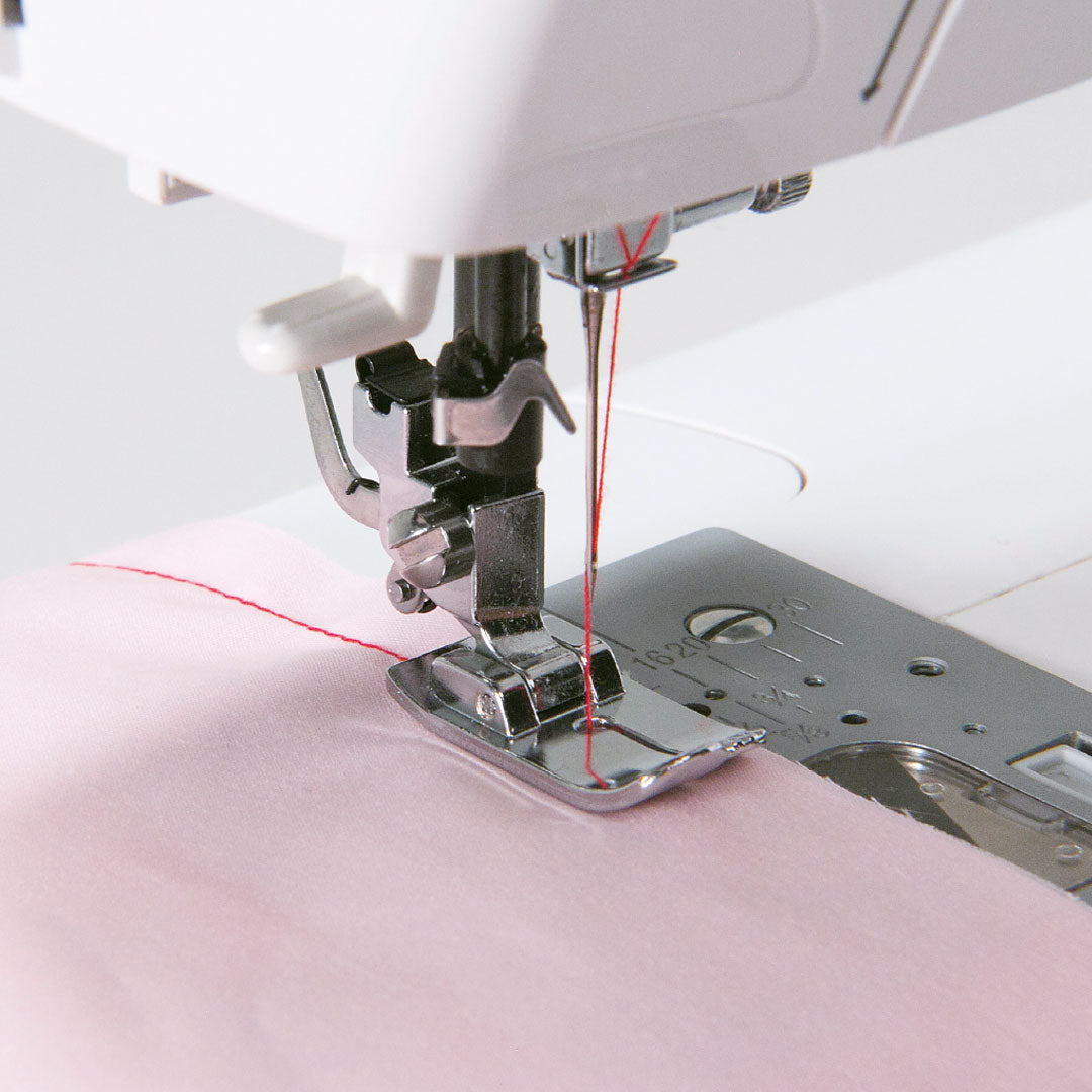 Denne trykkfoten er designet for å sy rette sting med nålen sentrert. Styrelinjene foran på høyre side av trykkfoten hjelper deg med å kontrollere bredden på sømmen. Føringslinjer er markert ved siden av nålen på 3, 5 og 7 mm, slik at du enkelt kan justere stingbredden. Ved å sy gjennom en liten rund åpning stabiliseres sømmen, noe som gir perfekte rettsøm. Denne trykkfoten er ideell for presis sying av rette sømmer med jevn stingavstand.